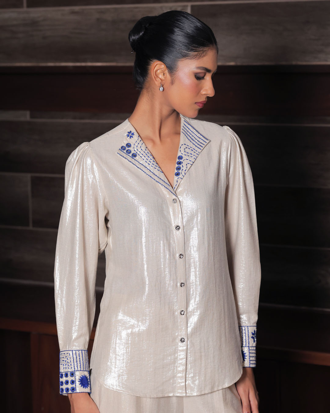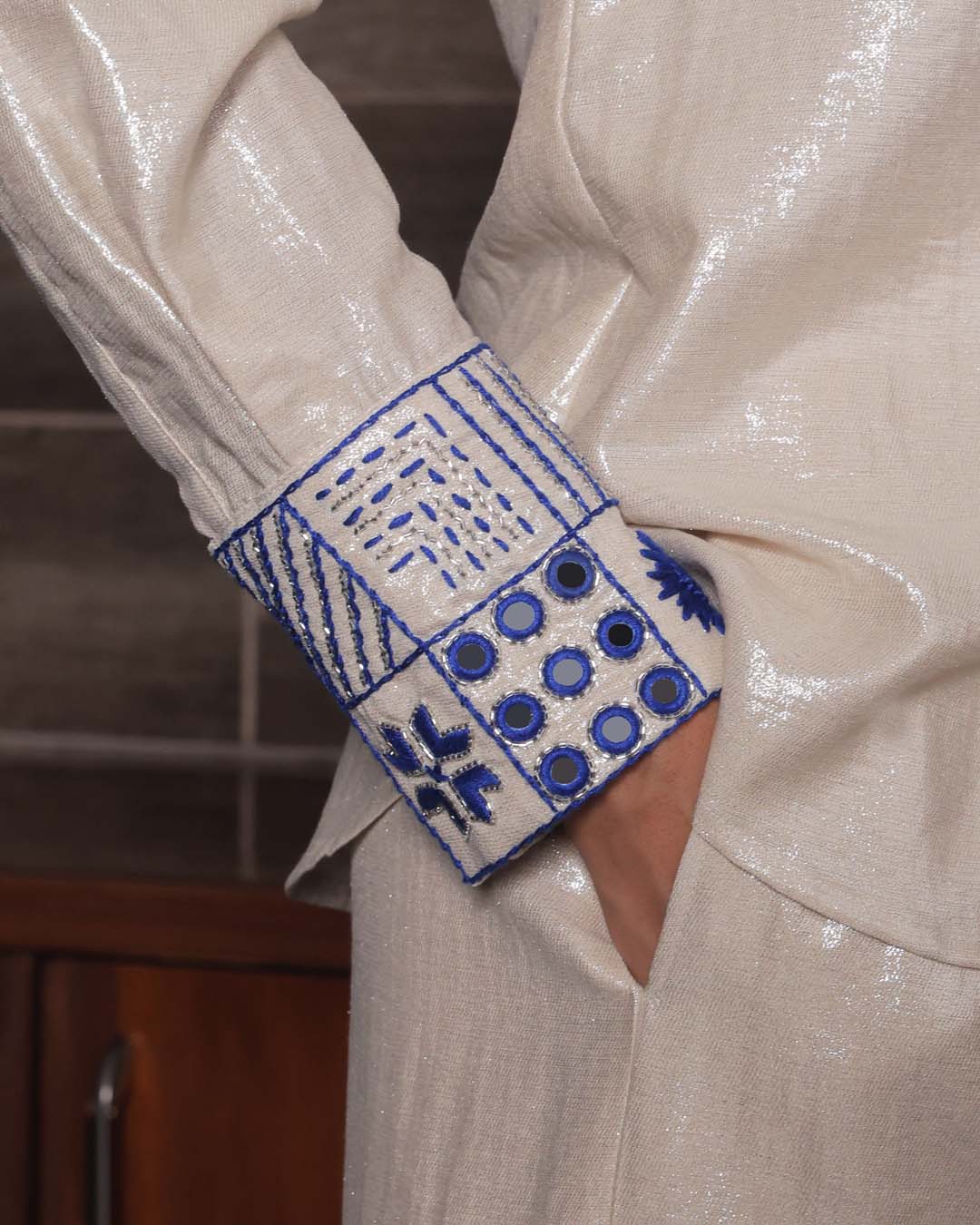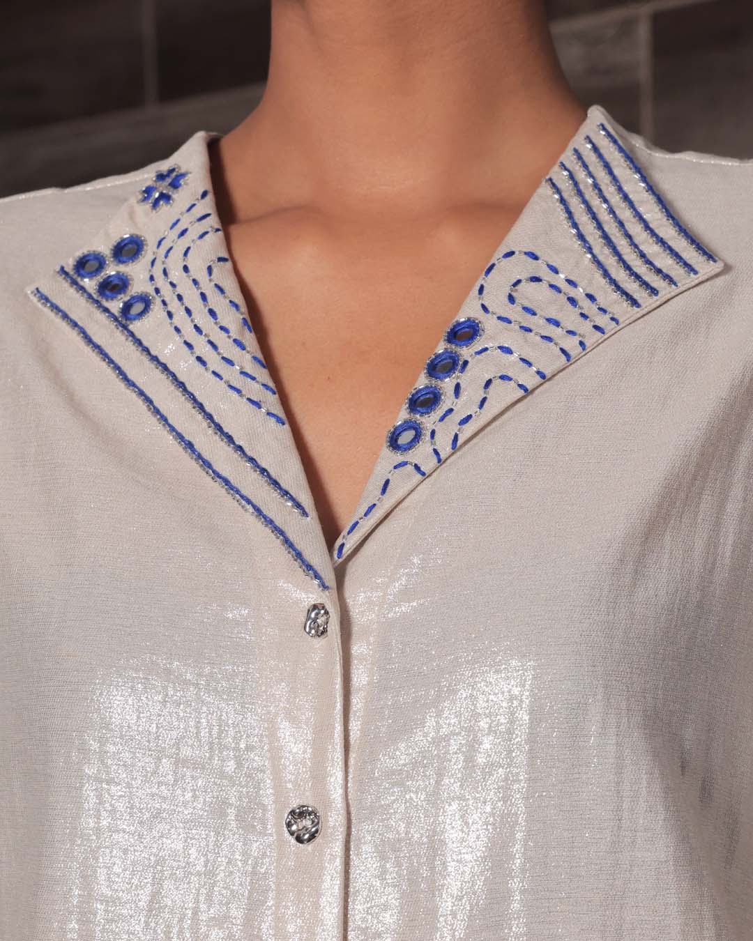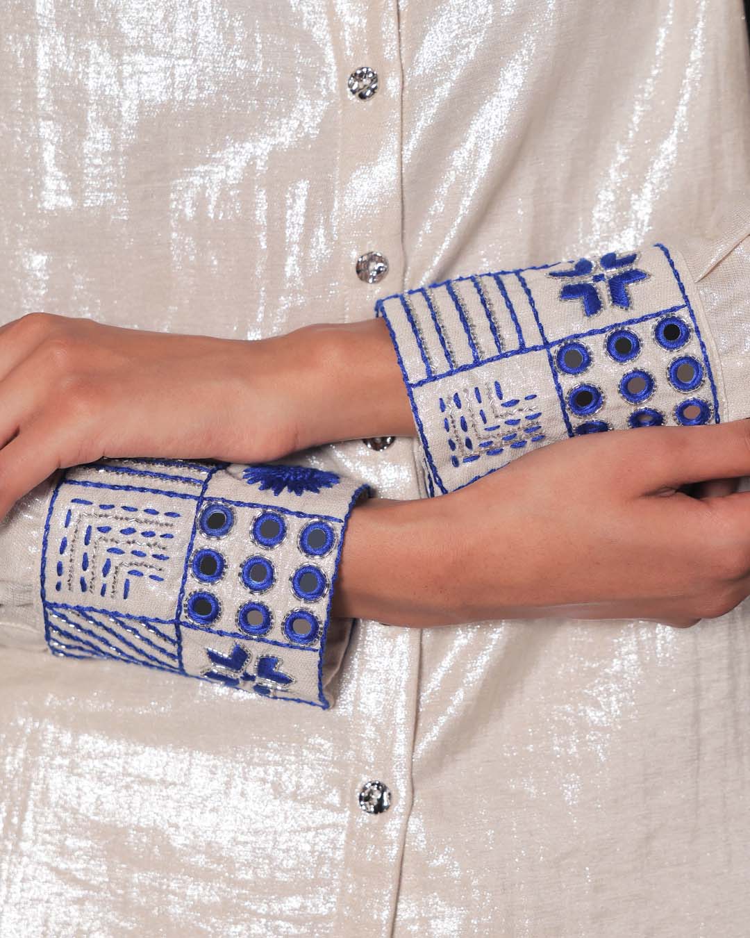 White linen shimmer set with blue hand-embroidery on cuff and collar. Hand-embroidery inspired by Shisha, Kantha, Phulkari and Chikankari embroidery.