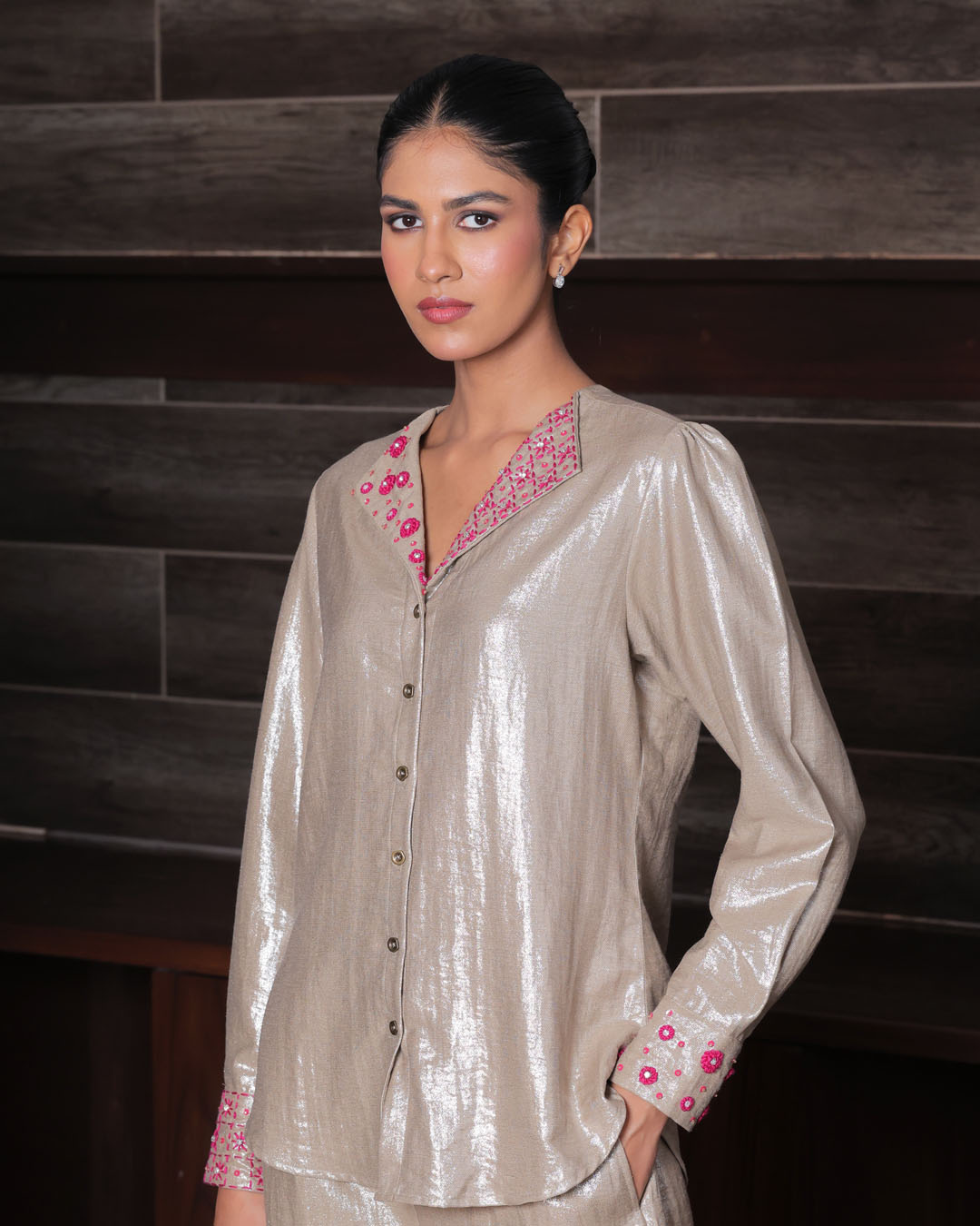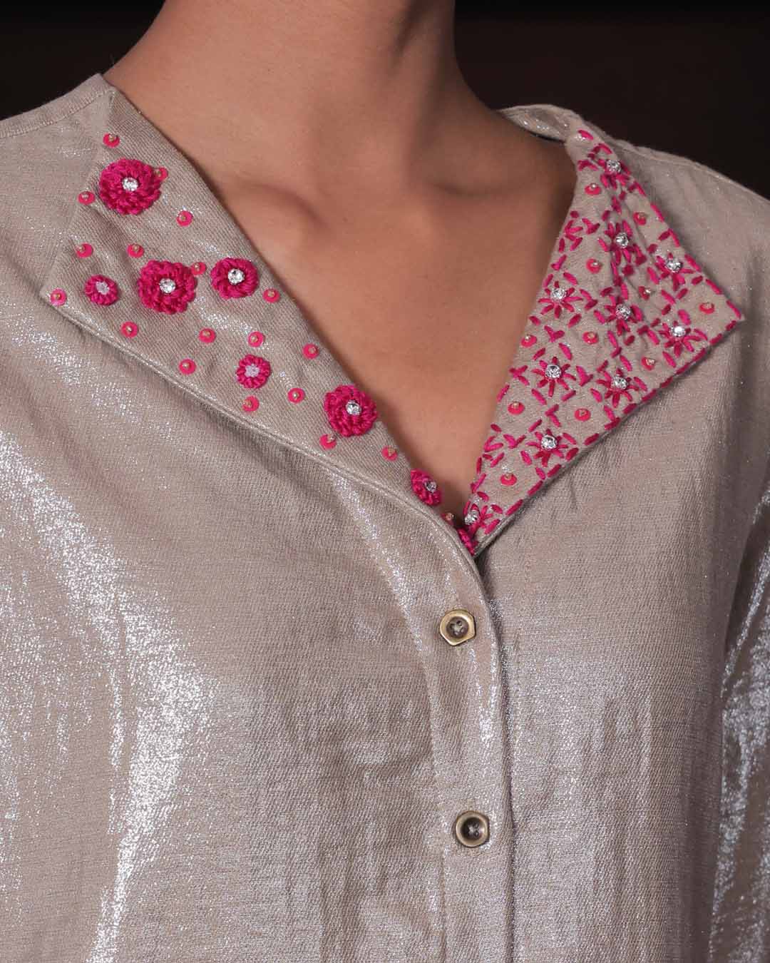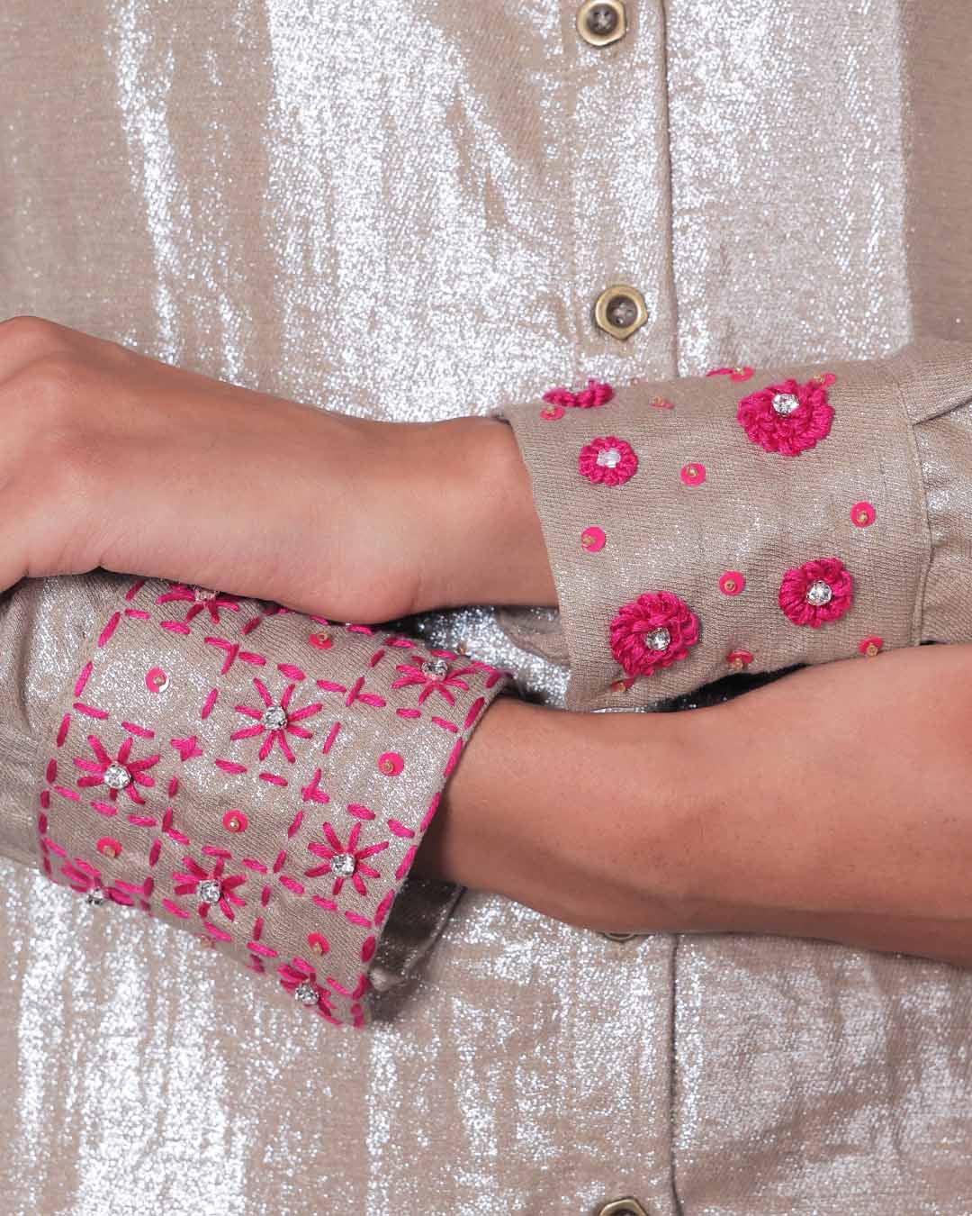 Brown shimmer set with alternate pink hand-embroidery on cuff and collar.