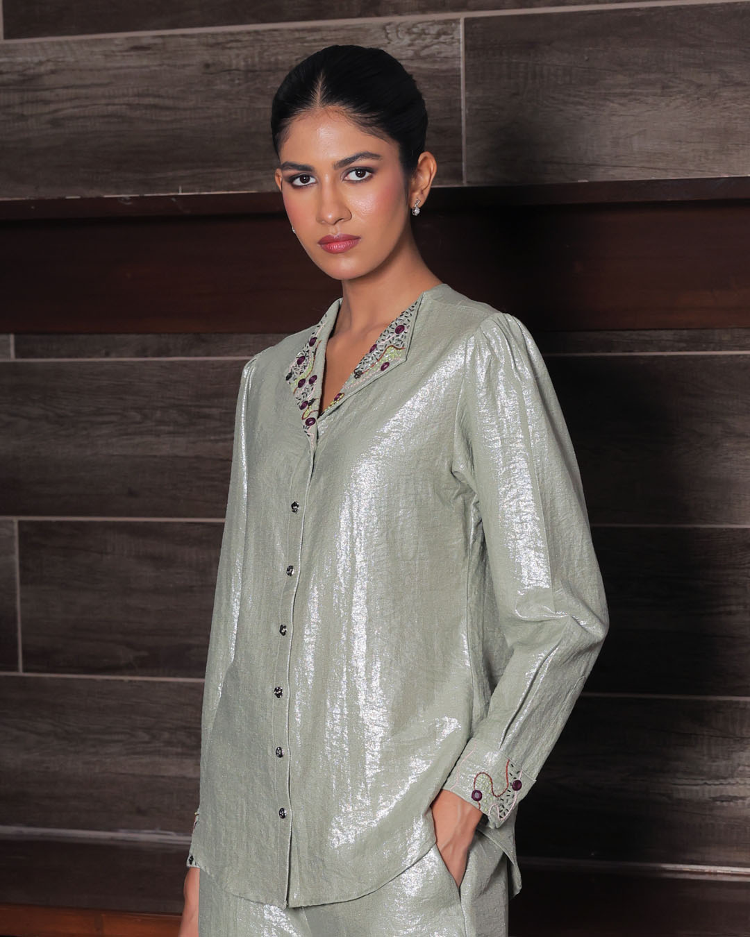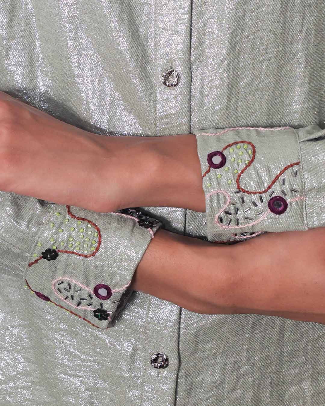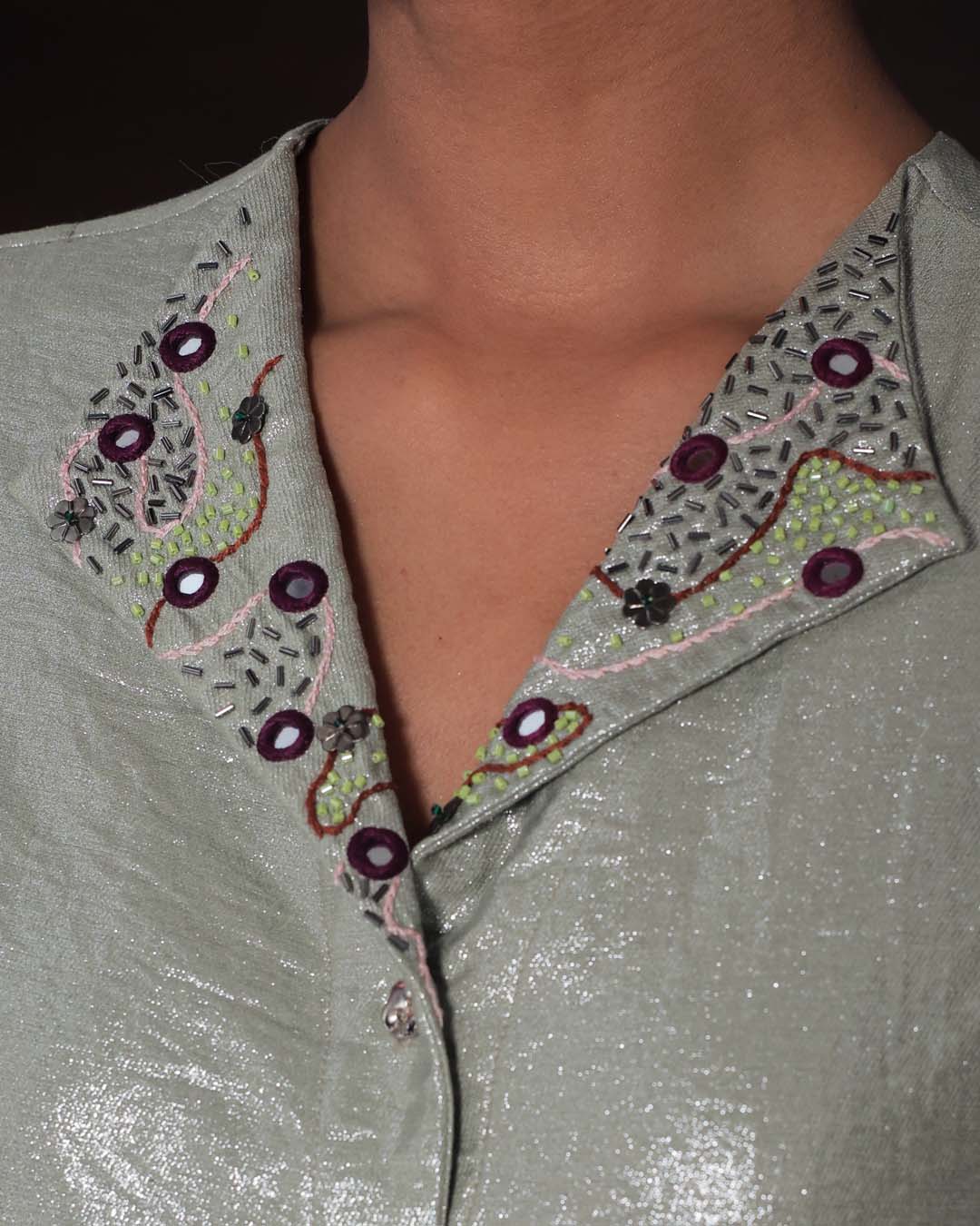 Light green shimmer set with plum mirrorwork and brown aari hand-embroidery on collar and cuffs