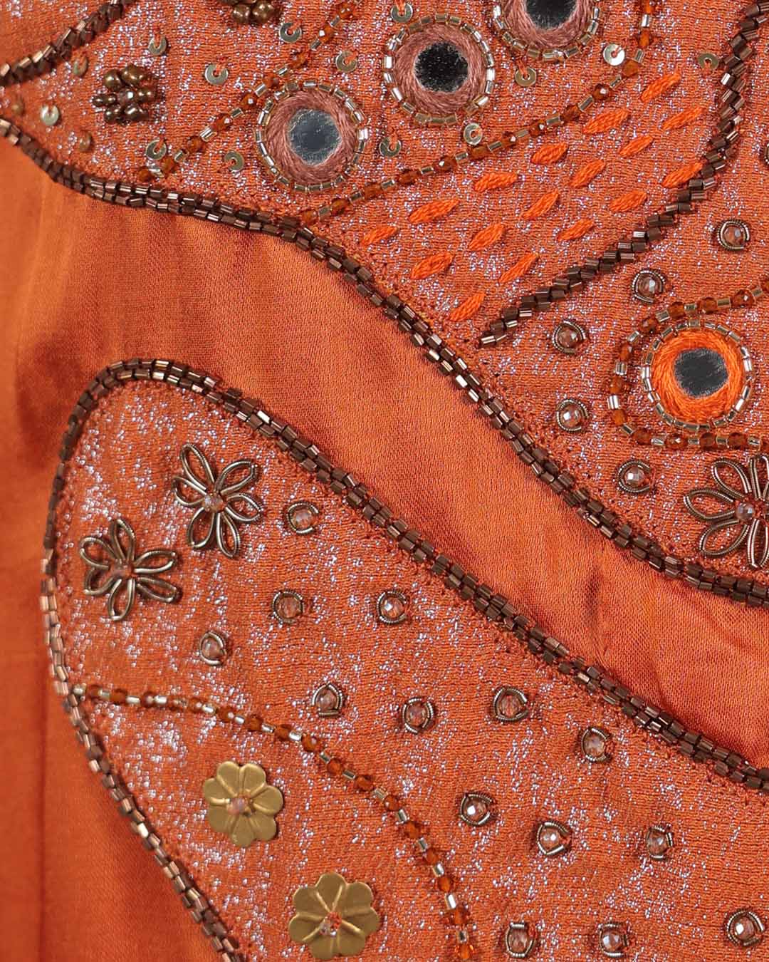 Burnt Orange dress with adjustable loops at the back. The embroidery is inspired by Mirror embroidery, Kantha embroidery and Zardozi embroidery, along with applique work.