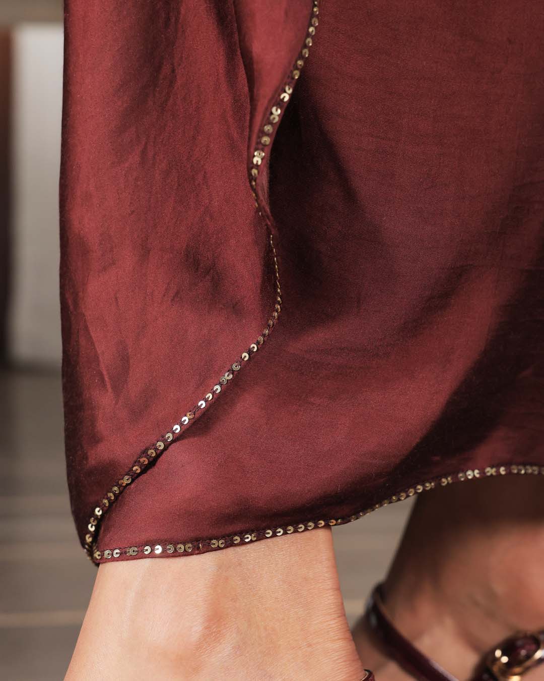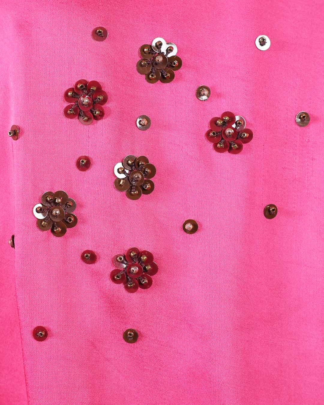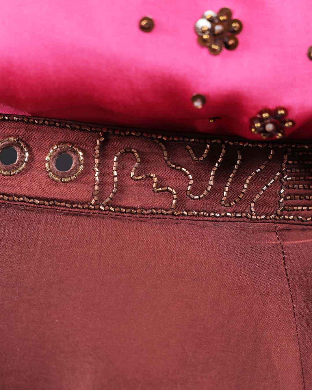 Pink Satin Hand-embroidered Sleeveless Top with Brown Satin Drape Skirt. The skirt's edges are fully lined with hand-sewn sequins. The belt of the skirt is fully embroidered as well.