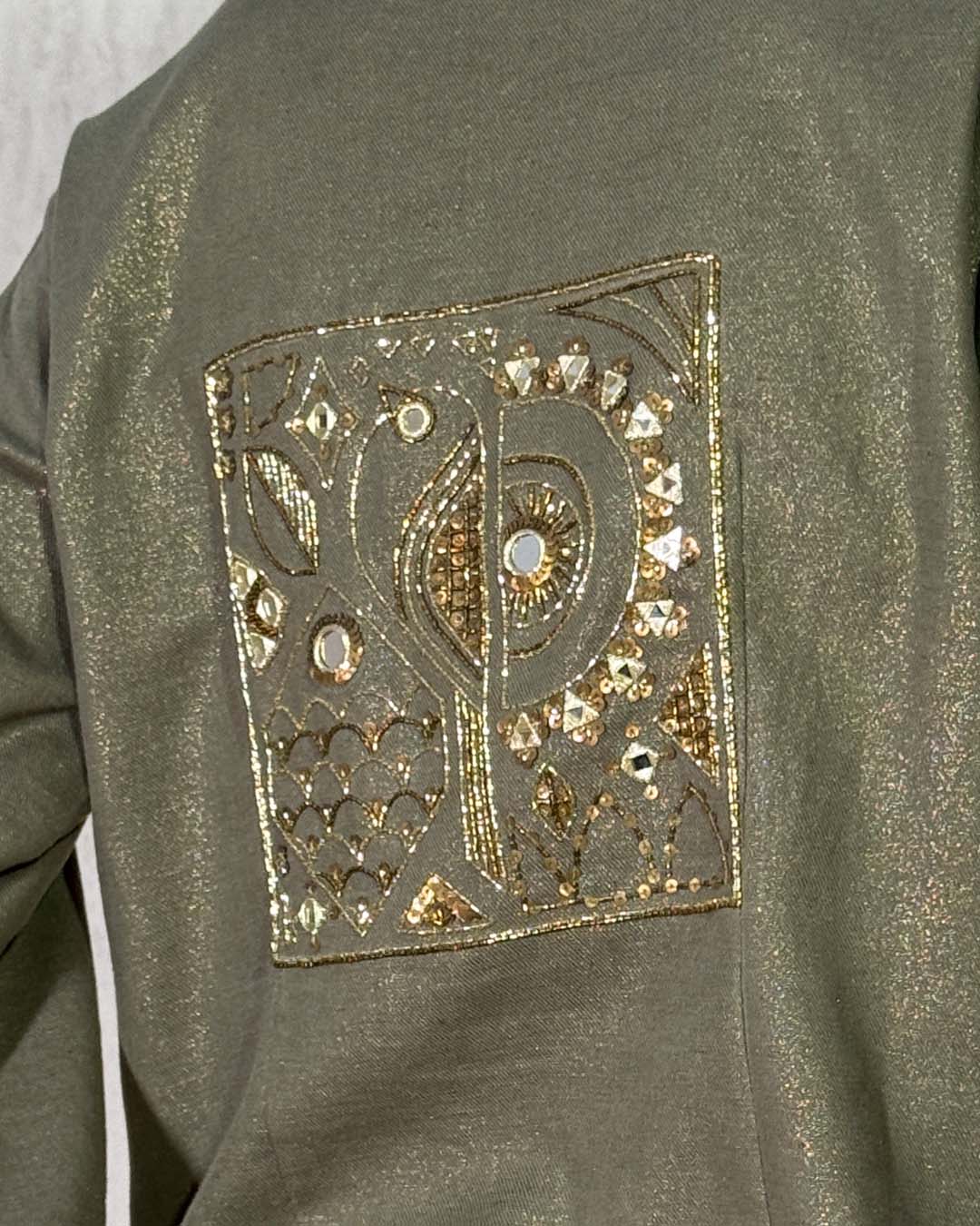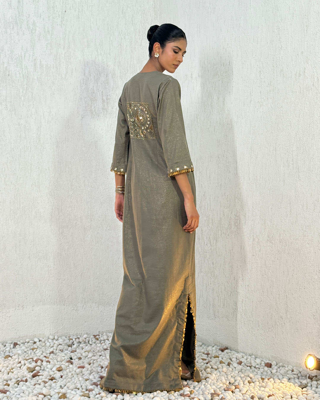 Green Linen Shimmer Long Kaftan with Aari and Mirror embroidery
