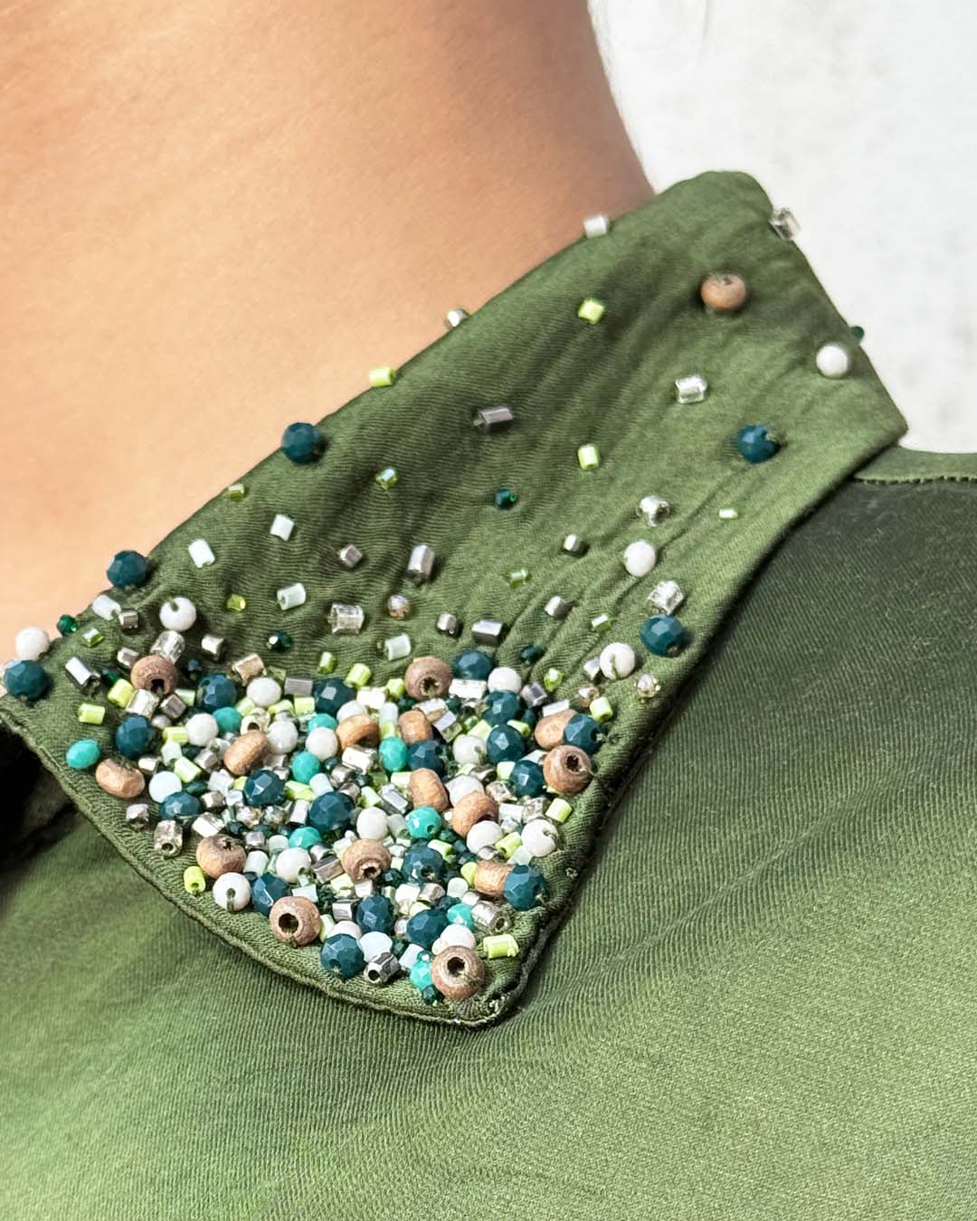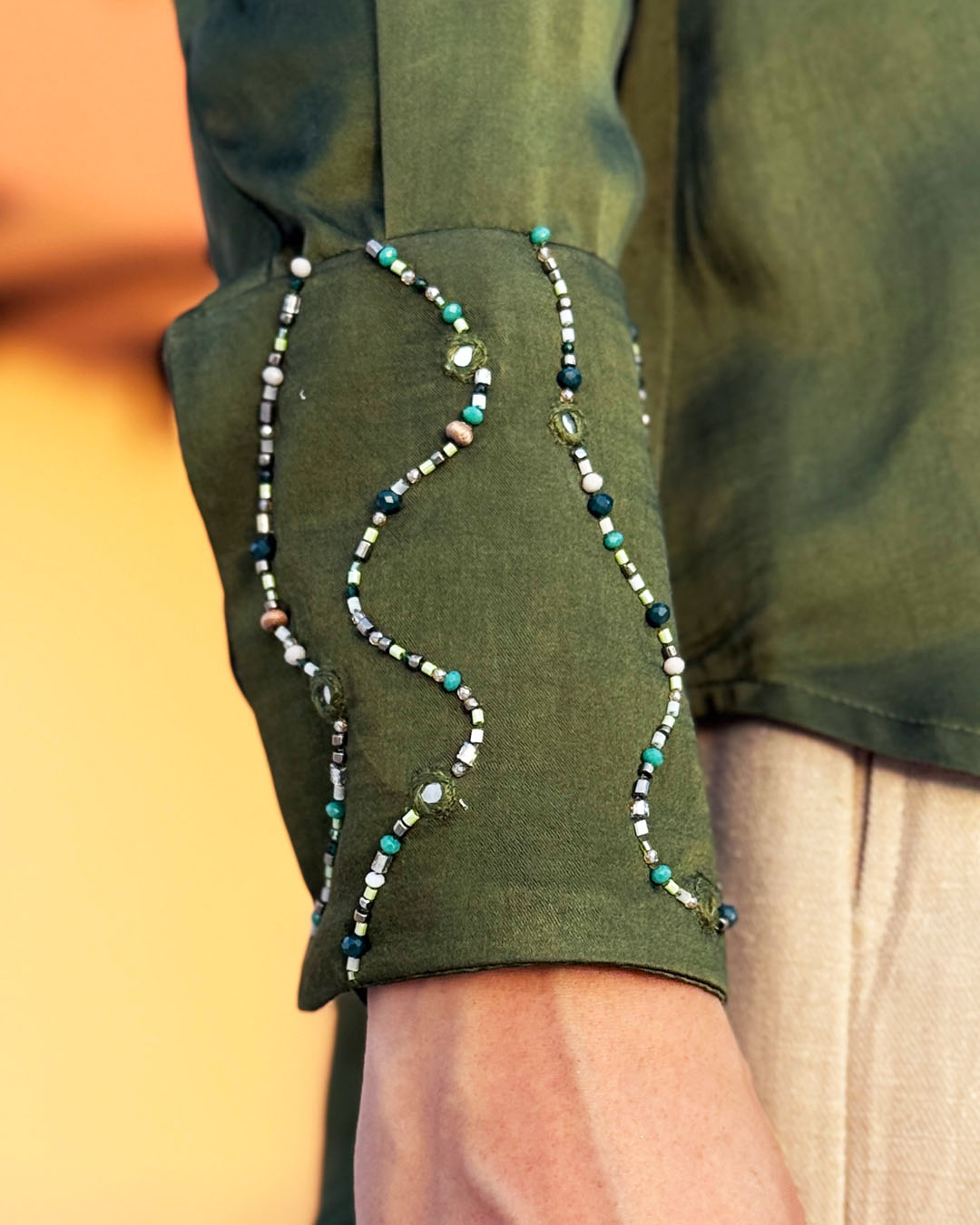 Olive Green shirt with assorted embellishment embroidery on collar and cuff.