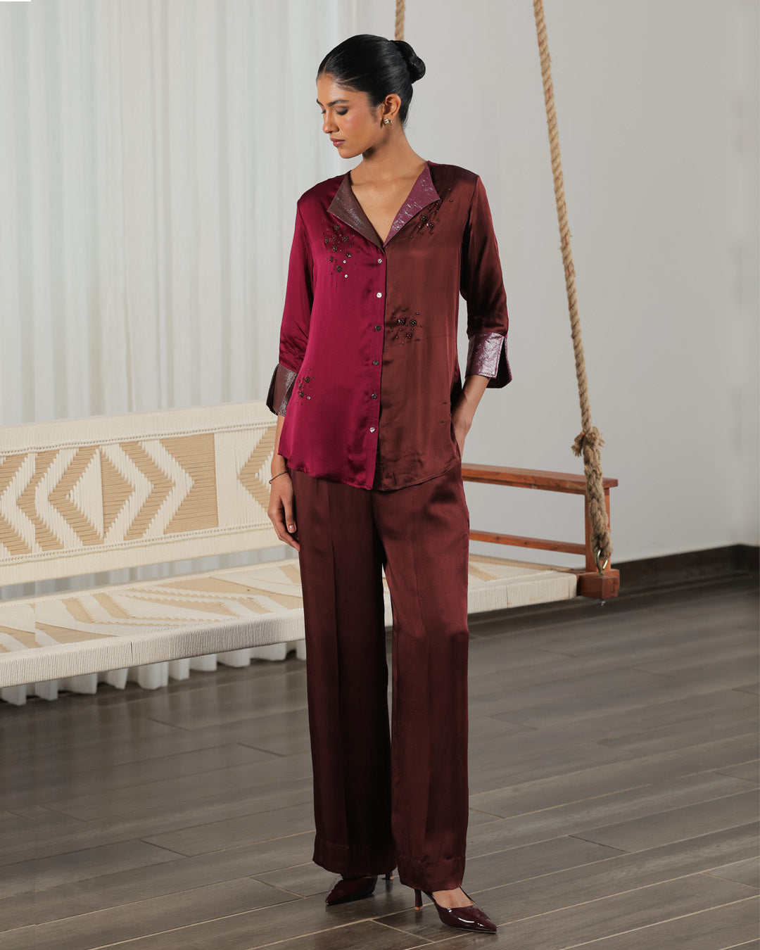 Half and Half Plum and Brown Shirt with scattered hand-embroidered flowers. Best paired with brown satin trousers. Tailoring detailing on the sleeves.