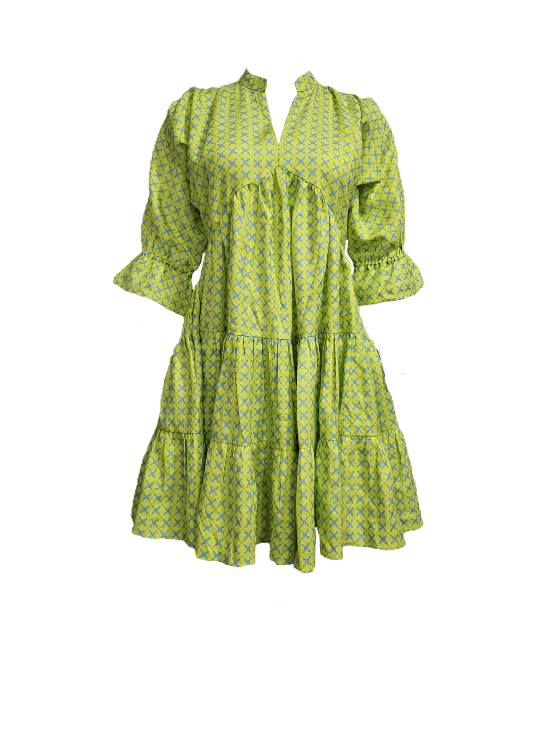 Stay effortlessly chic in our Dune Dress in Tessera. Crafted from breathable linen, this summer essential features a flared and tiered silhouette, falling to a mid-thigh length of 36". The V-neckline and fitted chest create a flattering shape, while gathered sleeves add a touch of elegance. Complete with practical side pockets, this versatile dress blends comfort and style, making it your go-to piece for sunny days.