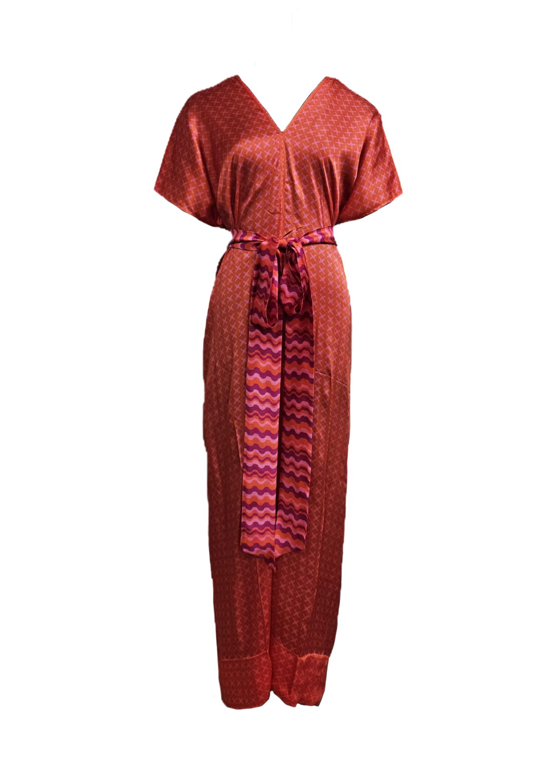 A jumpsuit like never before; with our free-size fit, featuring a stunning 55” length and flattering V-neck. Designed for comfort, it includes pockets on both sides and a deep back neck for added allure. The stylish belt ties around the waist twice, ensuring a perfect fit for any occasion.