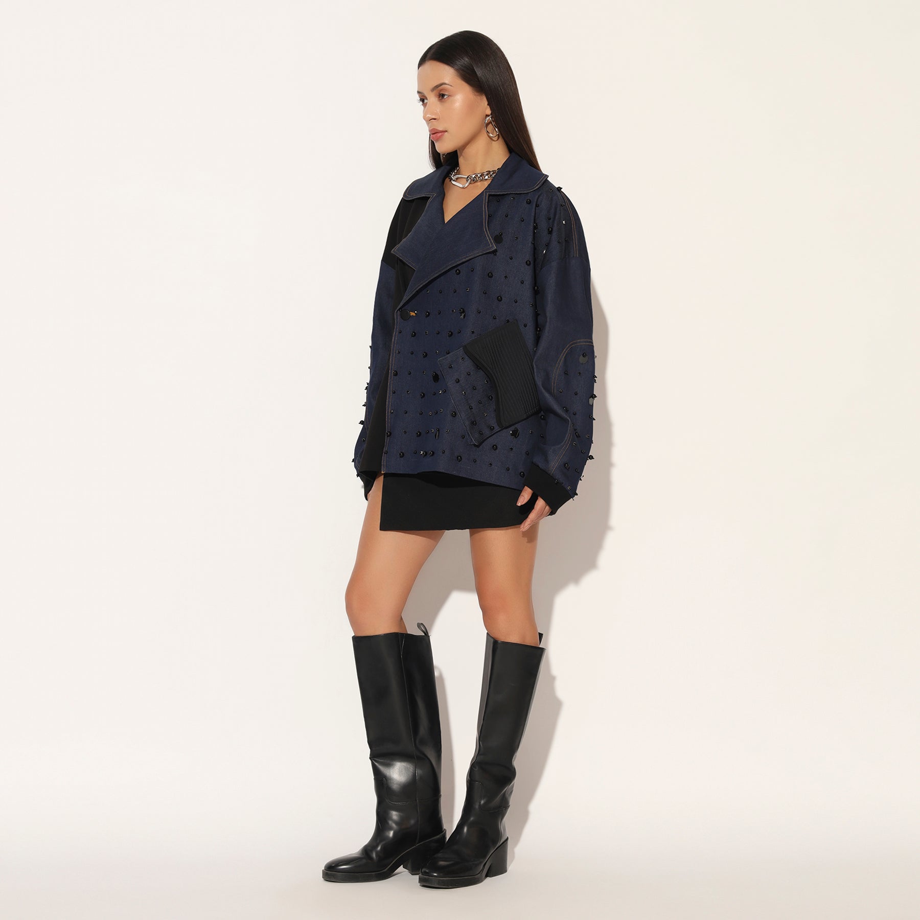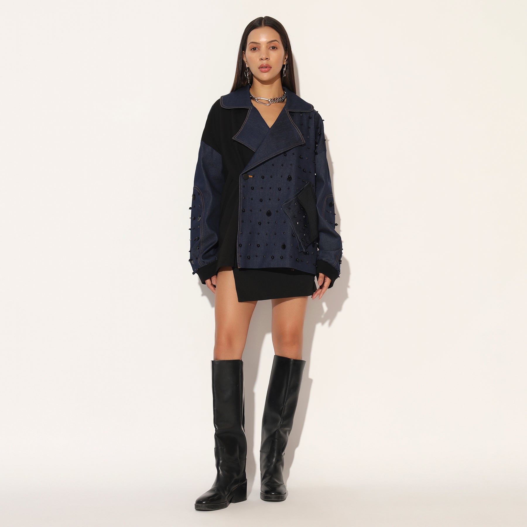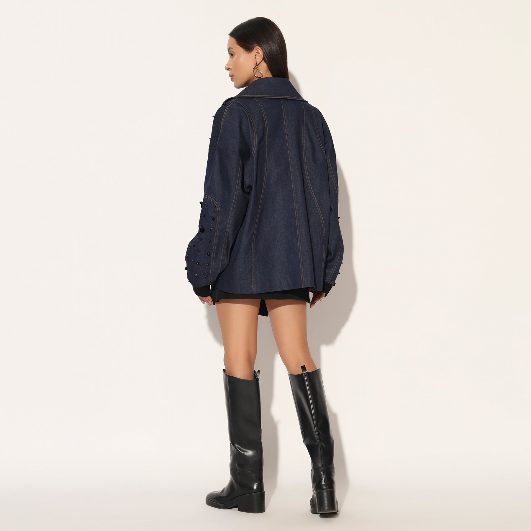 OVERSIZE DENIM PANEL JACKET WITH HAND DONE PLACEMENT EMBELLISHMENT